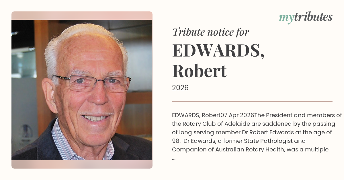 The President and members of the Rotary Club of Adelaide are saddened by the passing of long serving member Dr Robert Edwards at the age of 98. Dr Edwards, a former State Pathologist and Companion of Australian Rotary Health, was a multiple Paul Harris Fellow Awardee and member since 1974. We express our sincere condolences and appreciation to Robert's family for his outstanding long service to our community.