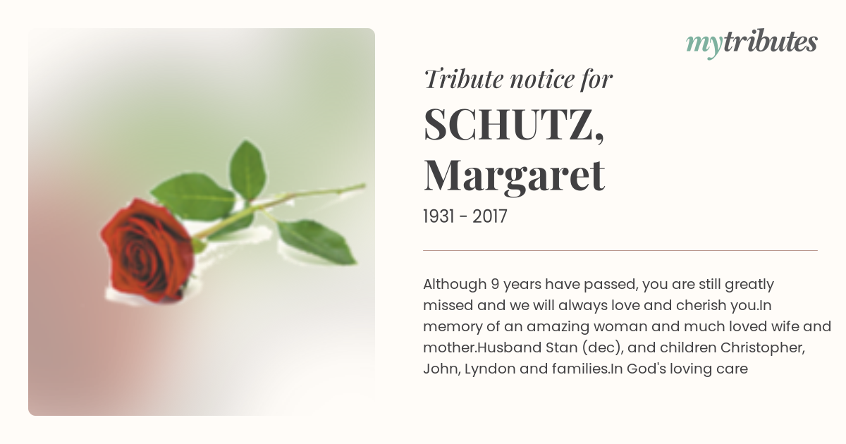 Husband Stan (dec), and children Christopher, John, Lyndon and families.