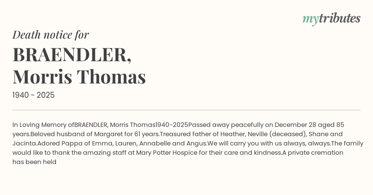 The family would like to thank the amazing staff at Mary Potter Hospice for their care and kindness.