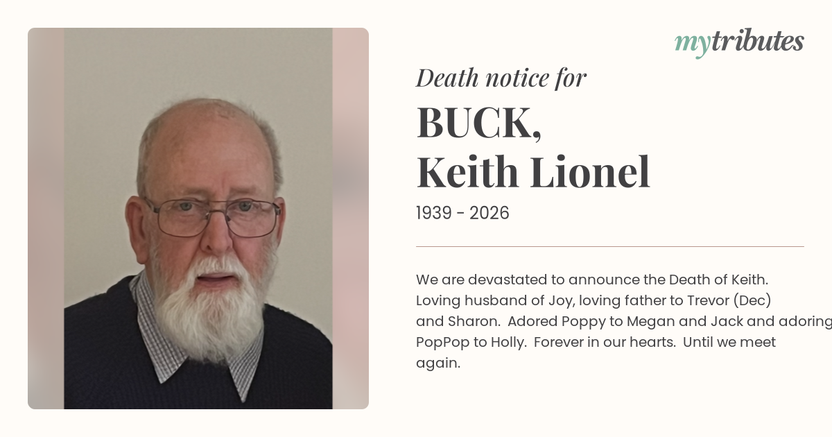 21°CWe are devastated to announce the Death of Keith. Loving husband of Joy, loving father to Trevor (Dec) and Sharon. Adored Poppy to Megan and Jack and adoring PopPop to Holly. Forever in our hearts. Until we meet again.