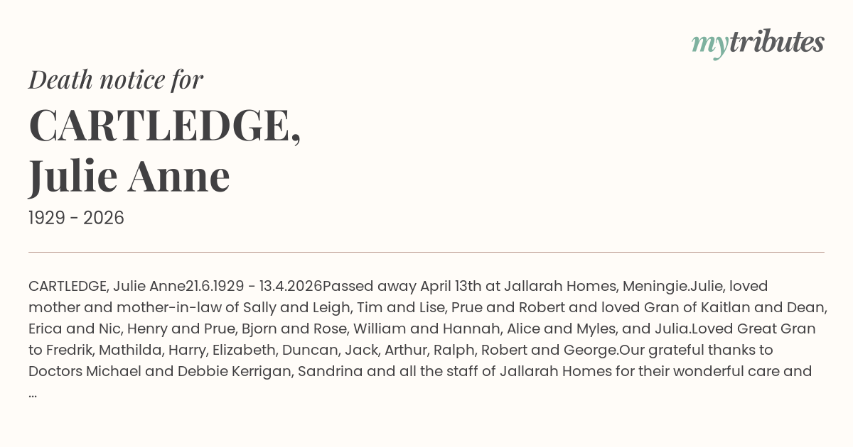 Julie, loved mother and mother-in-law of Sally and Leigh, Tim and Lise, Prue and Robert and loved Gran of Kaitlan and Dean, Erica and Nic, Henry and Prue, Bjorn and Rose, William and Hannah, Alice and Myles, and Julia.