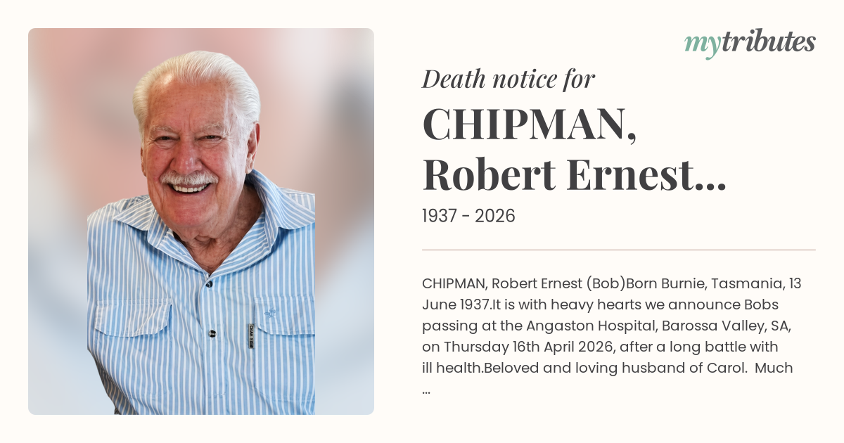 It is with heavy hearts we announce Bob’s passing at the Angaston Hospital, Barossa Valley, SA, on Thursday 16th April 2026, after a long battle with ill health.