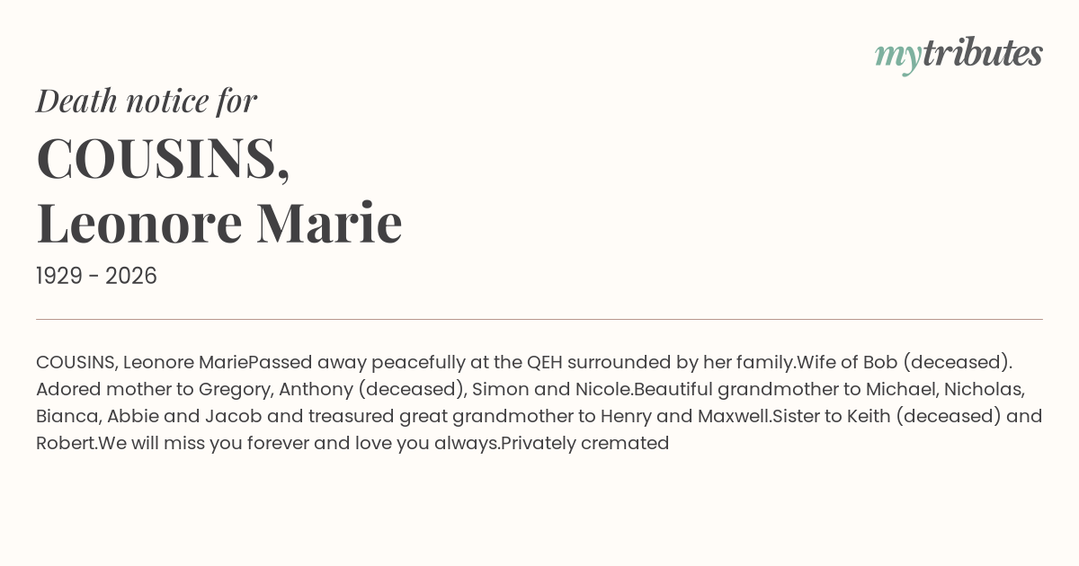 Adored mother to Gregory, Anthony (deceased), Simon and Nicole.