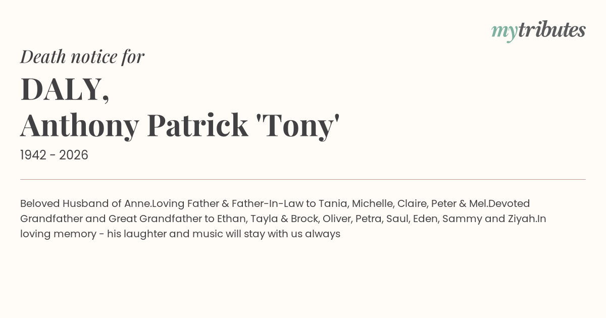 Loving Father & Father-In-Law to Tania, Michelle, Claire, Peter & Mel.