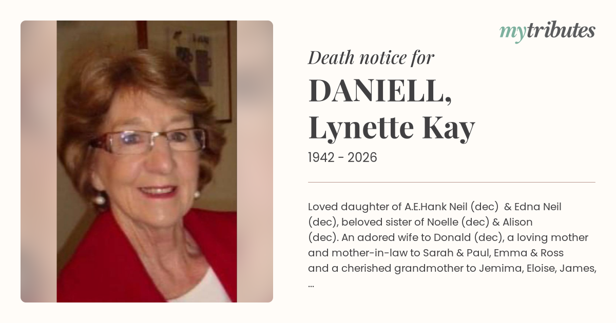 21°CLoved daughter of A.E.Hank Neil (dec) & Edna Neil (dec), beloved sister of Noelle (dec) & Alison (dec). An adored wife to Donald (dec), a loving mother and mother-in-law to Sarah & Paul, Emma & Ross and a cherished grandmother to Jemima, Eloise, James, Penelope and Hugo.