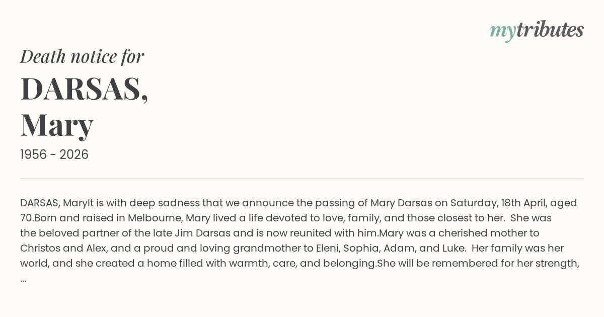 It is with deep sadness that we announce the passing of Mary Darsas on Saturday, 18th April, aged 70.