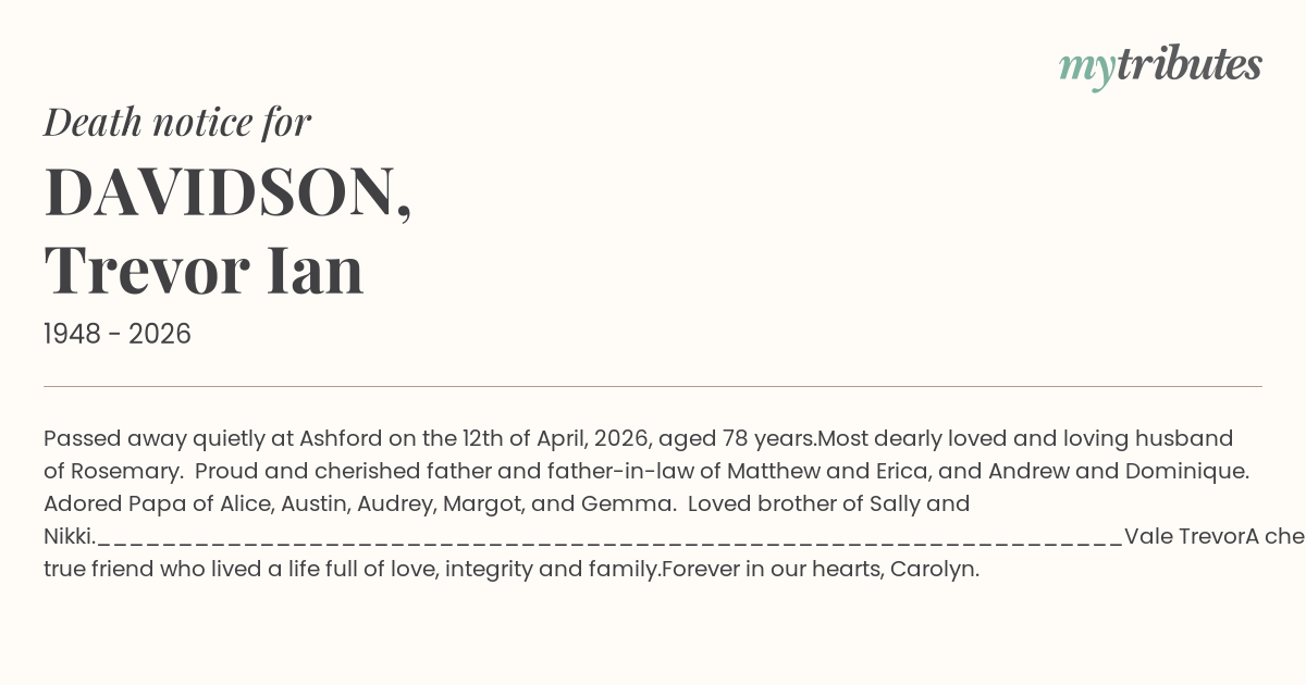 21°CPassed away quietly at Ashford on the 12th of April, 2026, aged 78 years.