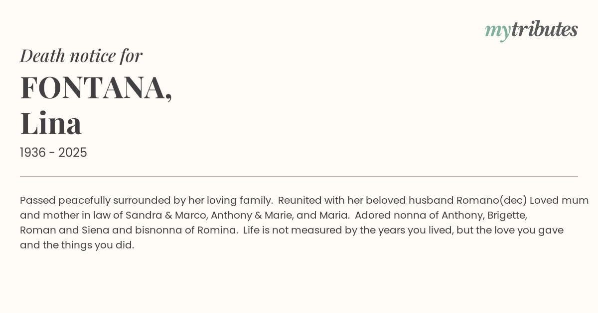 21°CPassed peacefully surrounded by her loving family. Reunited with her beloved husband Romano(dec) Loved mum and mother in law of Sandra & Marco, Anthony & Marie, and Maria. Adored nonna of Anthony, Brigette, Roman and Siena and bisnonna of Romina. Life is not measured by the years you lived, but the love you gave and the things you did.