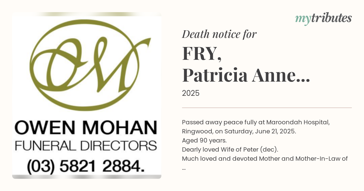 21°CPassed away peace fully at Maroondah Hospital, Ringwood, on Saturday, June 21, 2025.