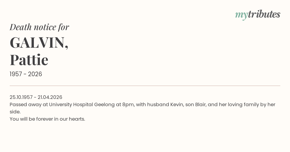 Passed away at University Hospital Geelong at 8pm, with husband Kevin, son Blair, and her loving family by her side.