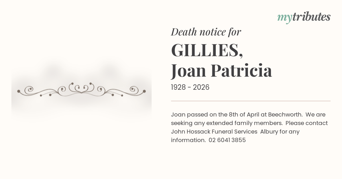 21°CJoan passed on the 8th of April at Beechworth. We are seeking any extended family members. Please contact John Hossack Funeral Services Albury for any information. 02 6041...