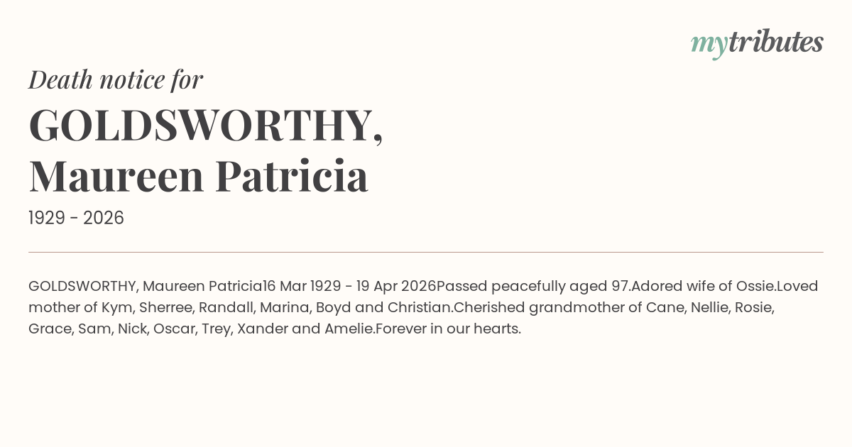 Loved mother of Kym, Sherree, Randall, Marina, Boyd and Christian.