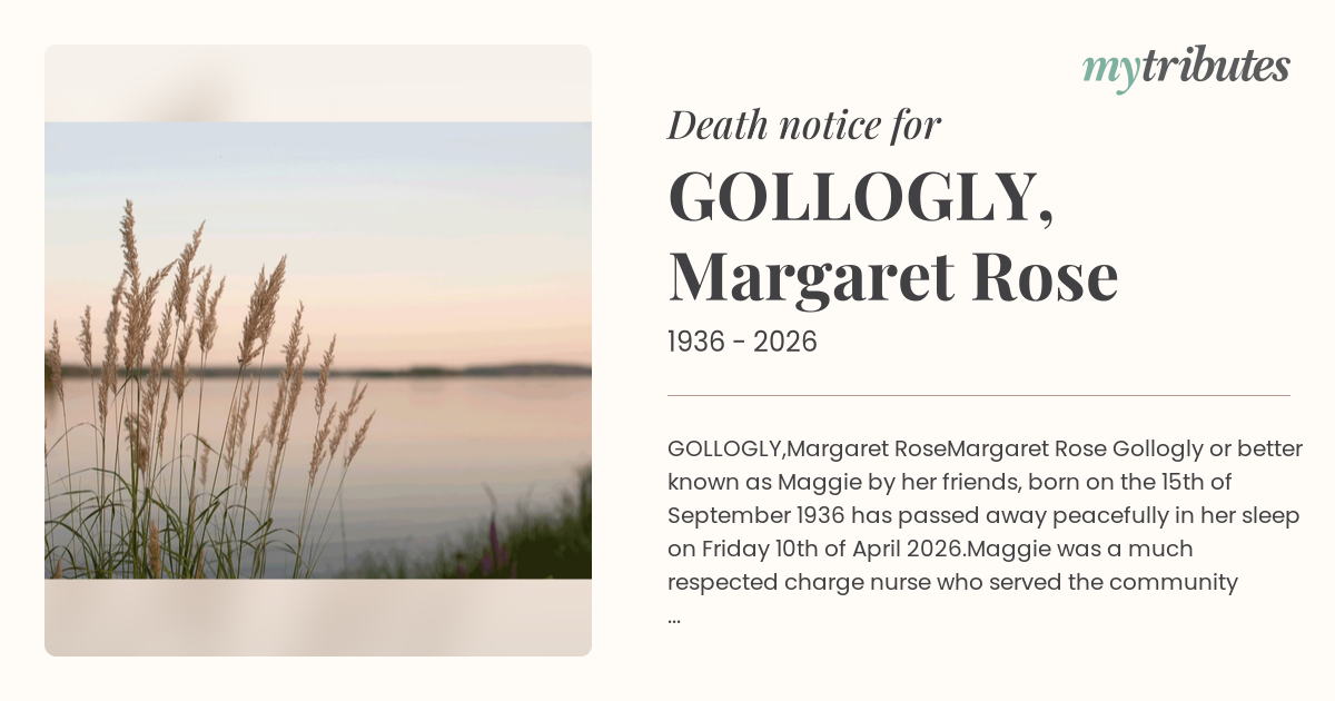 Margaret Rose Gollogly or better known as Maggie by her friends, born on the 15th of September 1936 has passed away peacefully in her sleep on Friday 10th of April 2026.