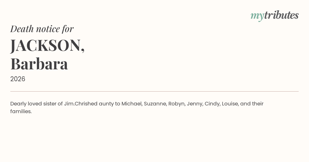 Chrished aunty to Michael, Suzanne, Robyn, Jenny, Cindy, Louise, and their families.