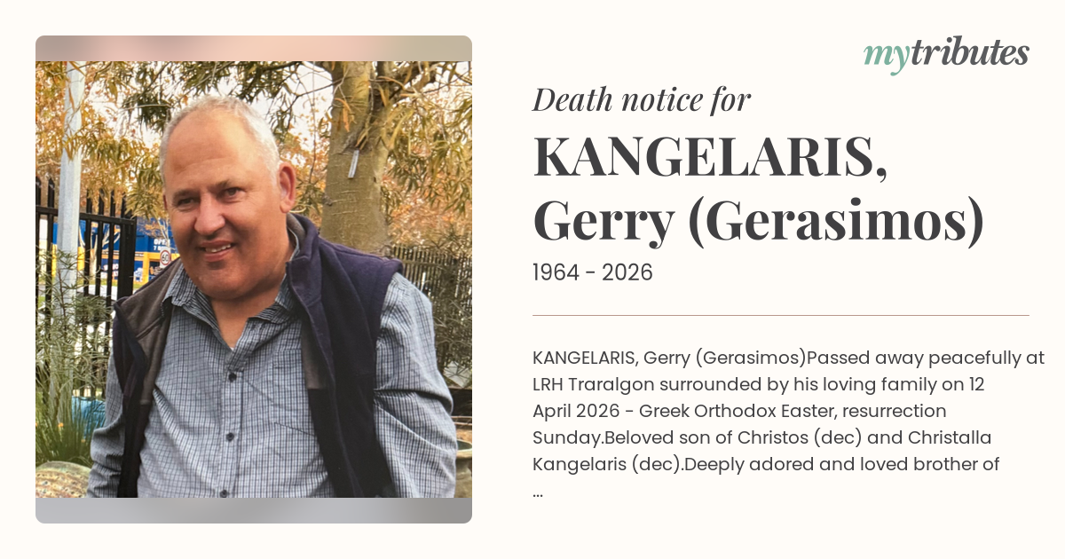 Passed away peacefully at LRH Traralgon surrounded by his loving family on 12 April 2026 - Greek Orthodox Easter, resurrection Sunday.