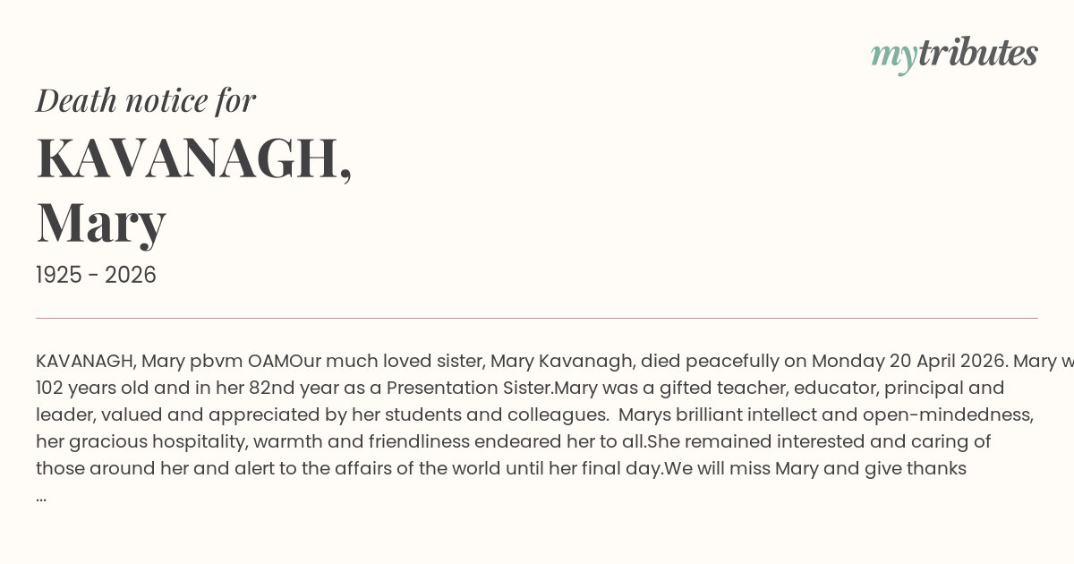 Our much loved sister, Mary Kavanagh, died peacefully on Monday 20 April 2026. Mary was 102 years old and in her 82nd year as a Presentation Sister.