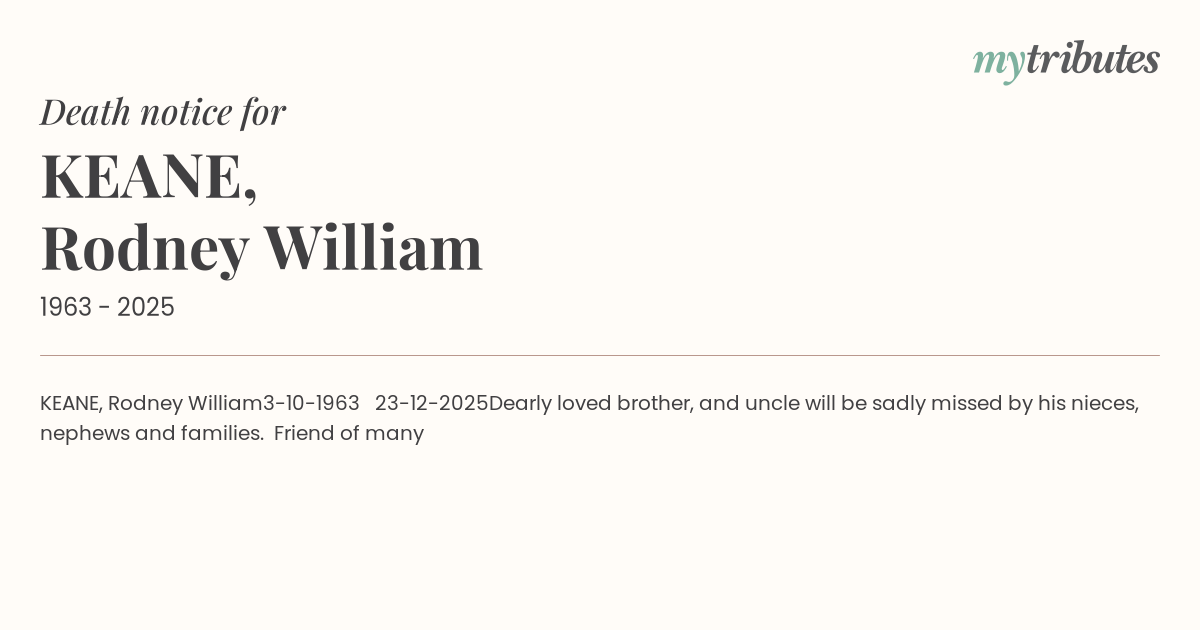 Dearly loved brother, and uncle will be sadly missed by his nieces, nephews and families.