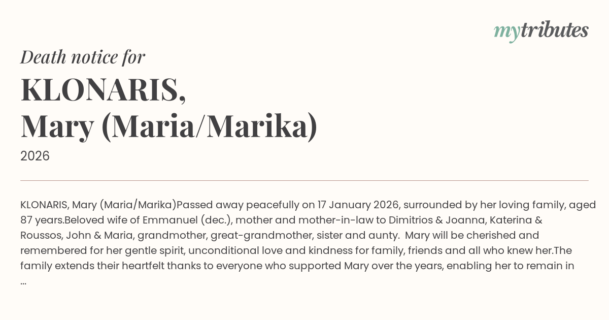in-law to Dimitrios & Joanna, Katerina & Roussos, John & Maria, grandmother, great-grandmother, sister and aunty. Mary will be cherished and remembered for her gentle spirit, unconditional love and kindness for family, friends and all who knew her.