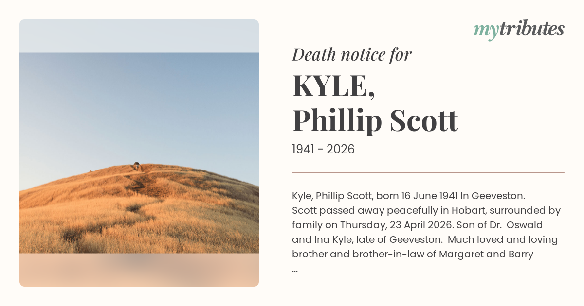 21°CKyle, Phillip Scott, born 16 June 1941 In Geeveston. “Scott” passed away peacefully in Hobart, surrounded by family on Thursday, 23 April 2026.