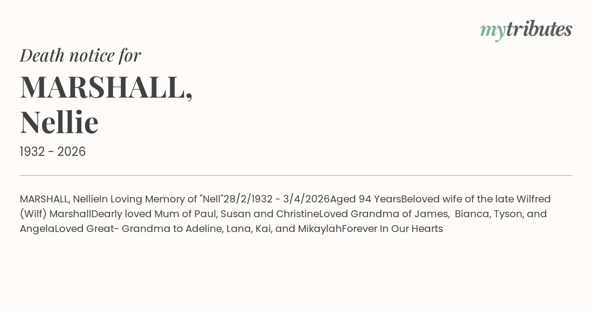 Beloved wife of the late Wilfred (Wilf) Marshall