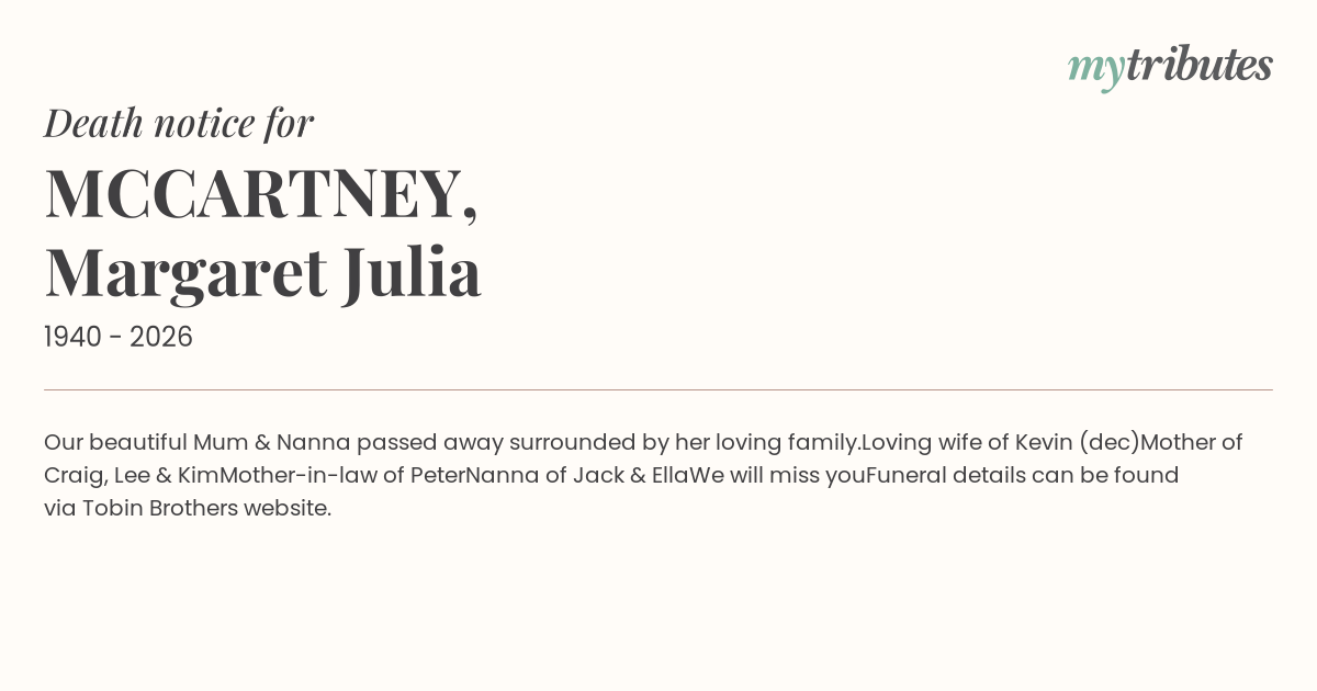 Funeral details can be found via Tobin Brothers website.