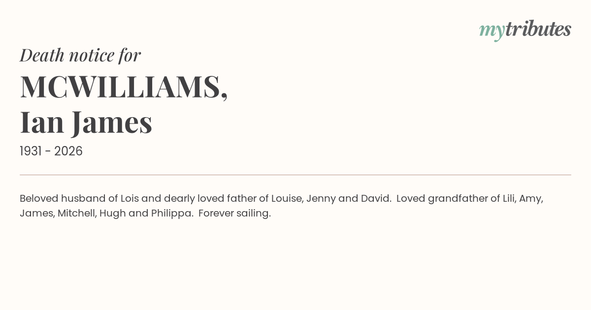 21°CBeloved husband of Lois and dearly loved father of Louise, Jenny and David. Loved grandfather of Lili, Amy, James, Mitchell, Hugh and Philippa. Forever sailing.