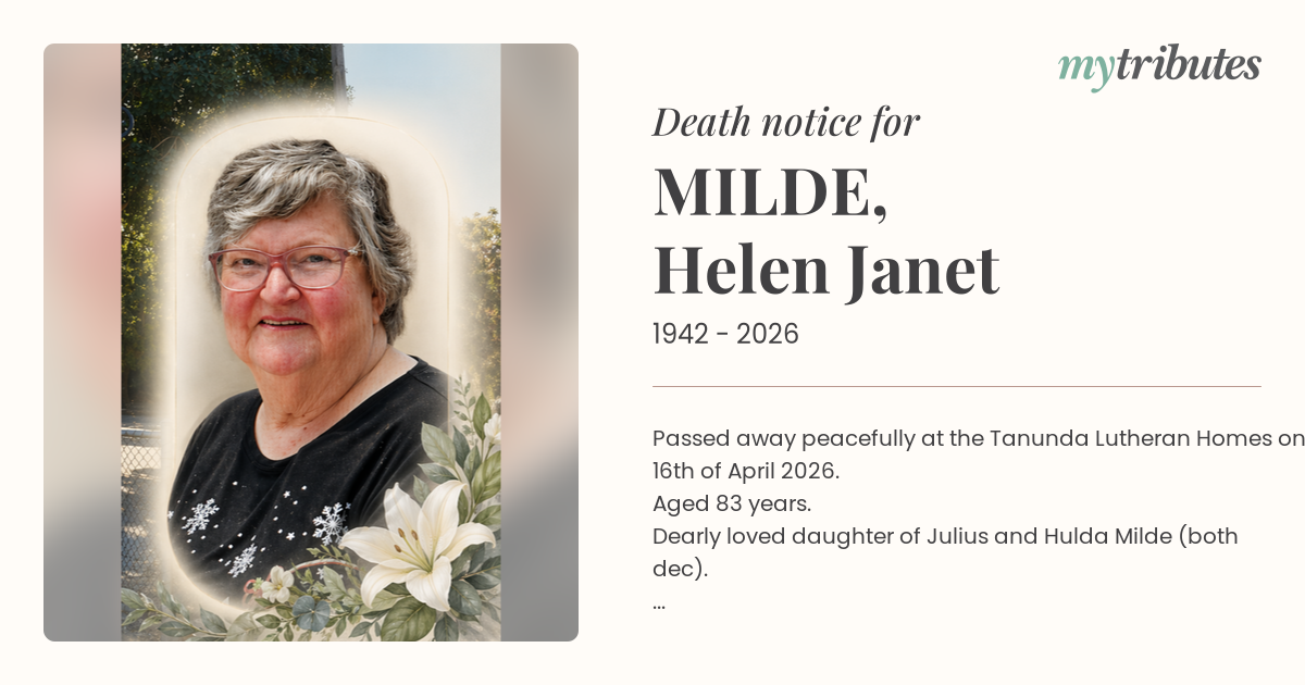 21°CPassed away peacefully at the Tanunda Lutheran Homes on 16th of April 2026.