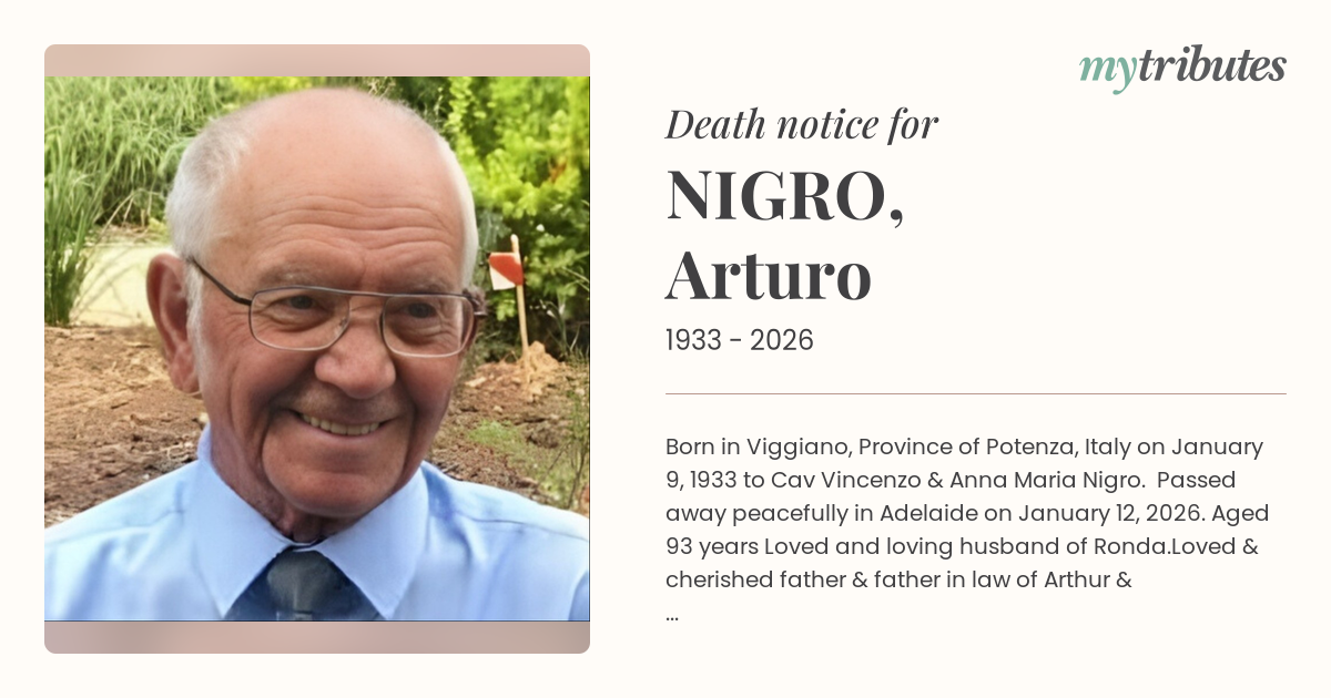 21°CBorn in Viggiano, Province of Potenza, Italy on January 9, 1933 to Cav Vincenzo & Anna Maria Nigro. Passed away peacefully in Adelaide on January 12, 2026. Aged 93 years Loved and loving husband of Ronda.