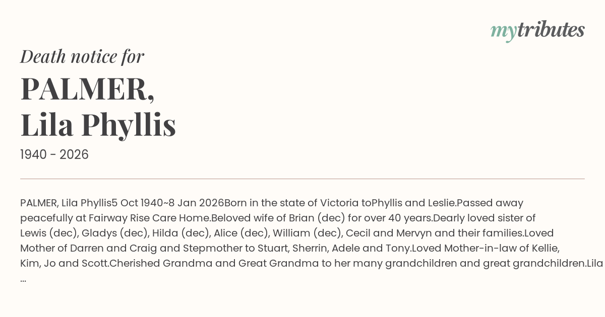 The family would like to thank the management and staff at Fairway Rise for their excellent care and support of Lila over the past two years.
