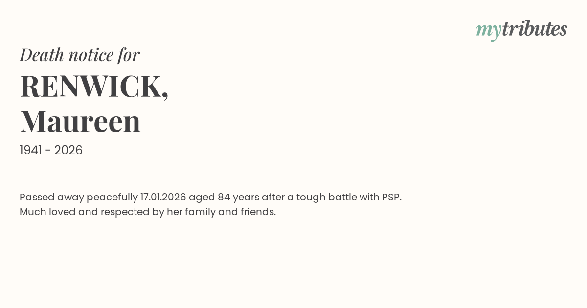 21°CPassed away peacefully 17.01.2026 aged 84 years after a tough battle with PSP.