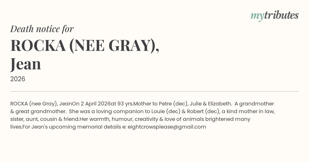 For Jean's upcoming memorial details e: eightcrowsplease@gmail.com