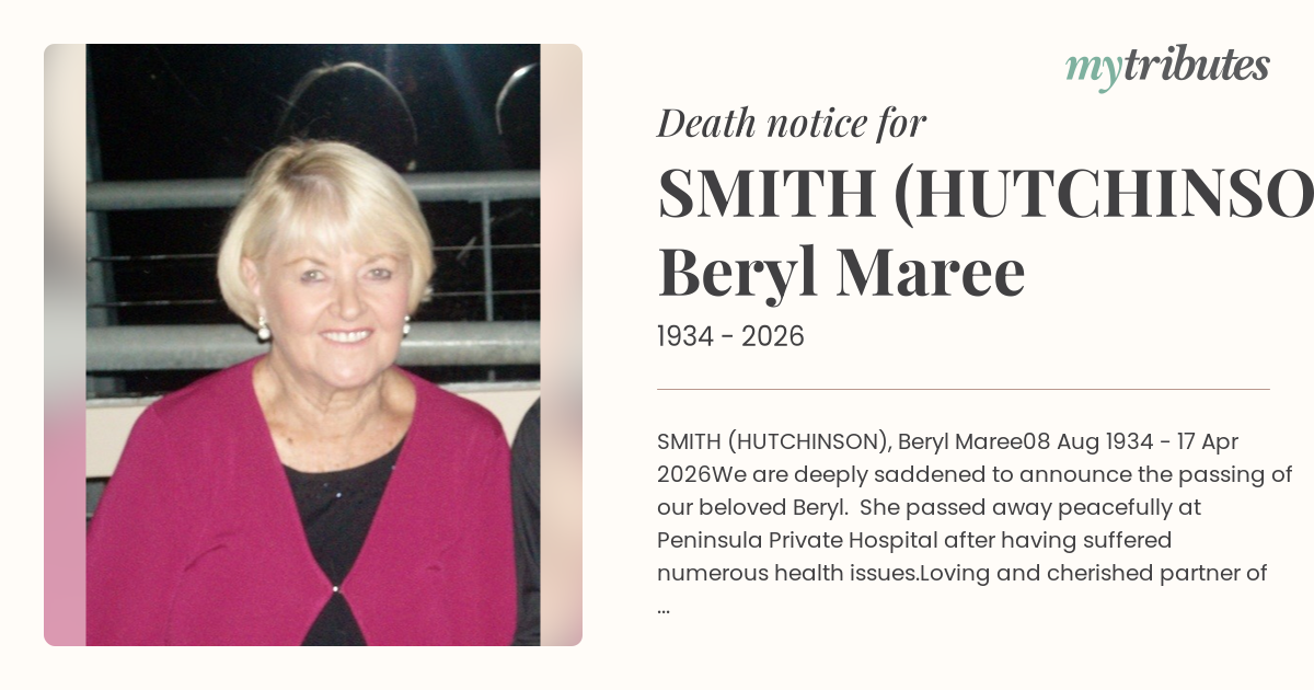 to announce the passing of our beloved Beryl. She passed away peacefully at Peninsula Private Hospital after having suffered numerous health issues.