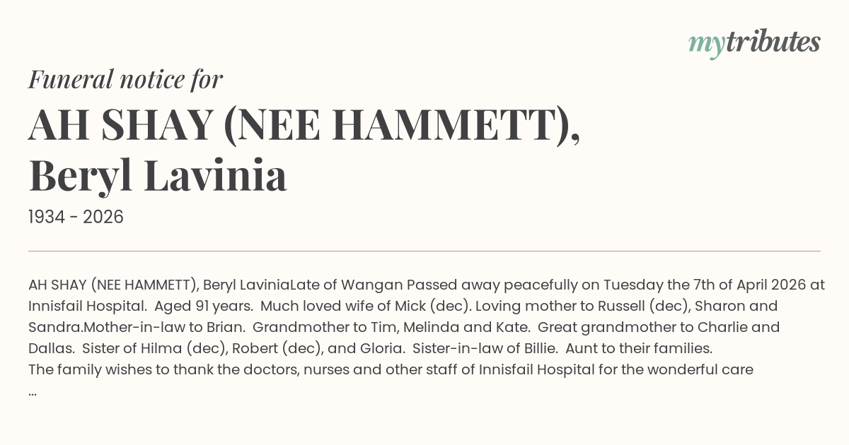 Passed away peacefully on Tuesday the 7th of April 2026 at Innisfail Hospital. Aged 91 years.