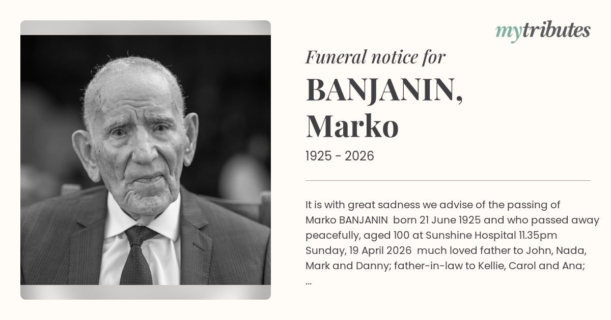 21°CIt is with great sadness we advise of the passing of Marko BANJANIN – born 21 June 1925 and who passed away peacefully, aged 100 at Sunshine Hospital 11.35pm Sunday, 19 April 2026 – much loved father to John, Nada, Mark and Danny; father-in-law to Kellie, Carol and Ana; beloved grandfather to Peter, Dasha, Zane and Sara.