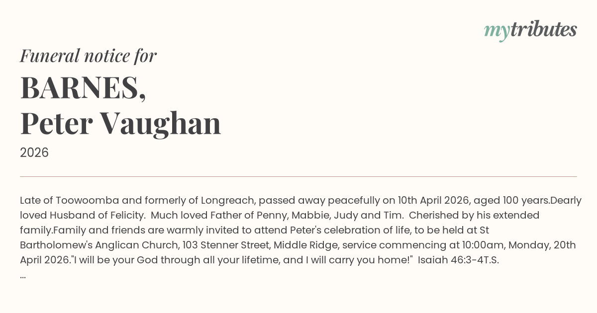 Family and friends are warmly invited to attend Peter's celebration of life, to be held at St Bartholomew's Anglican Church, 103 Stenner Street, Middle Ridge, service commencing at 10:00am, Monday, 20th April 2026.