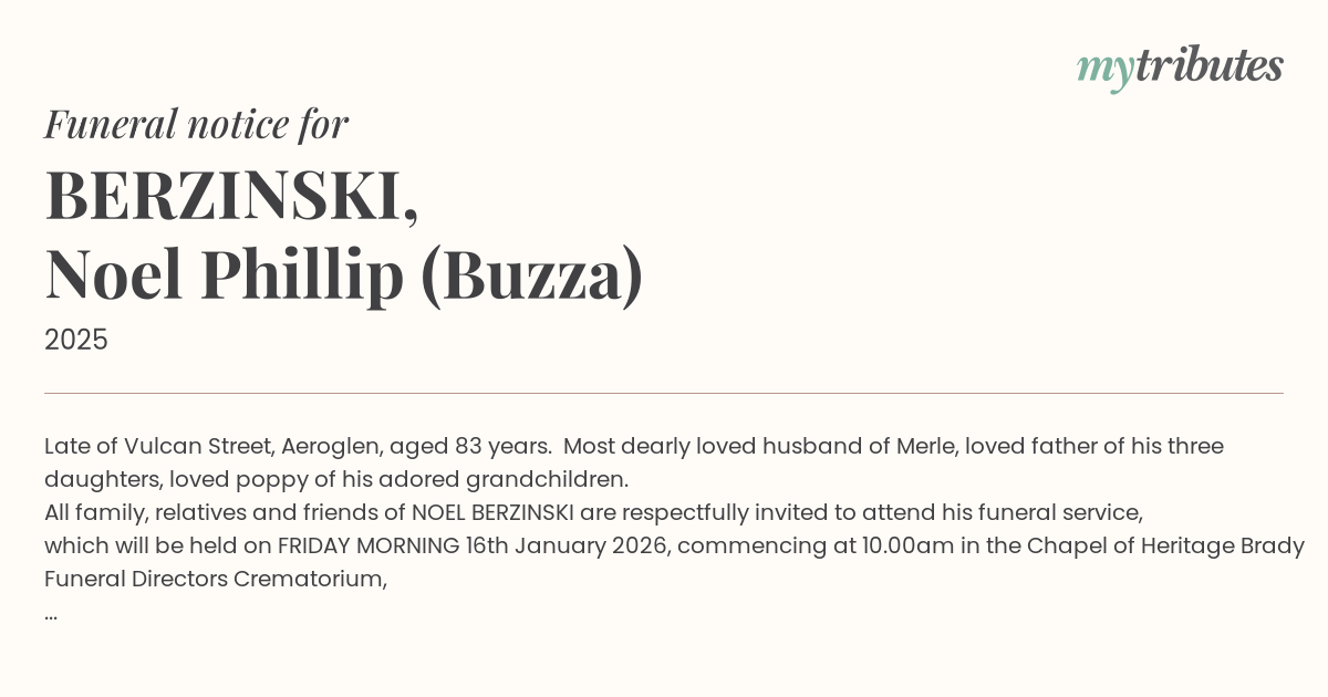 All family, relatives and friends of NOEL BERZINSKI are respectfully invited to attend his funeral service, which will be held on FRIDAY MORNING 16th January 2026, commencing at 10.00am in the Chapel of Heritage Brady Funeral Directors Crematorium,