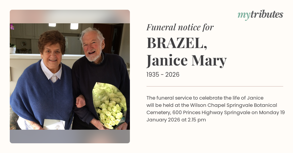 21°CThe funeral service to celebrate the life of Janice will be held at the Wilson Chapel Springvale Botanical Cemetery, 600 Princes Highway Springvale on Monday 19 January 2026 at 2.15 pm