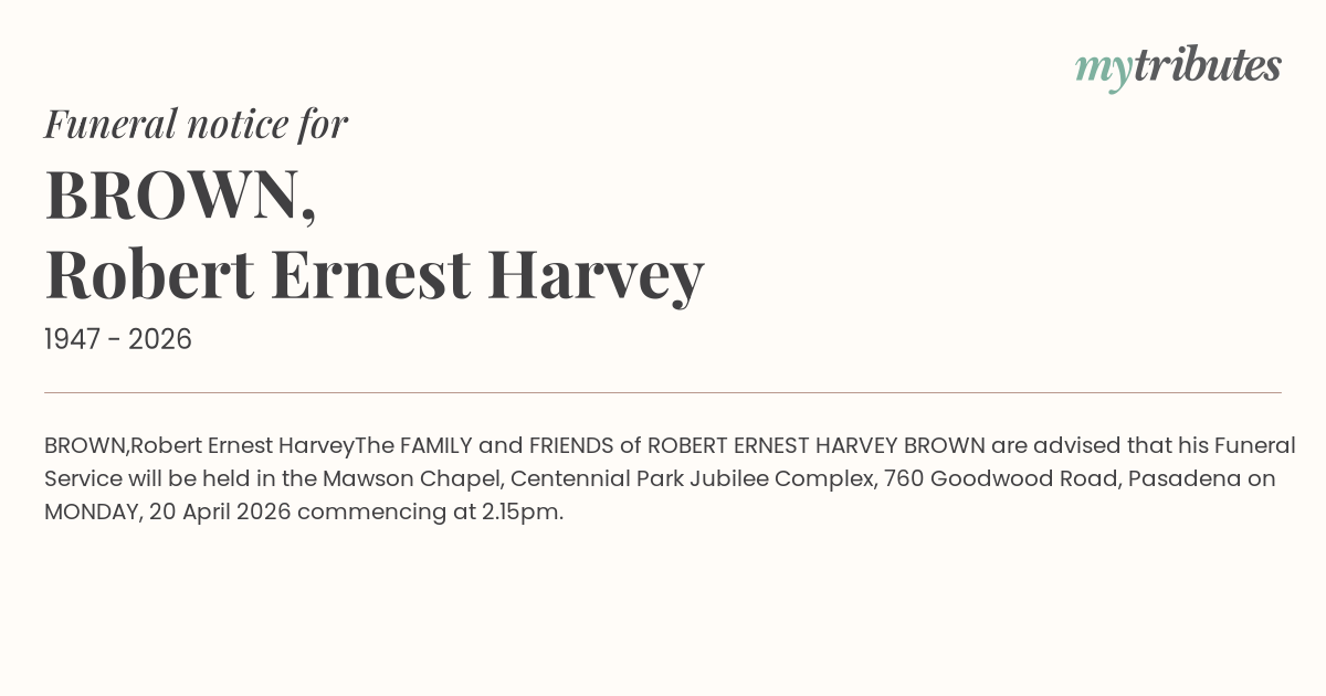 The FAMILY and FRIENDS of ROBERT ERNEST HARVEY BROWN are advised that his Funeral Service will be held in the Mawson Chapel, Centennial Park Jubilee Complex, 760 Goodwood Road, Pasadena on MONDAY, 20 April 2026 commencing at 2.15pm.