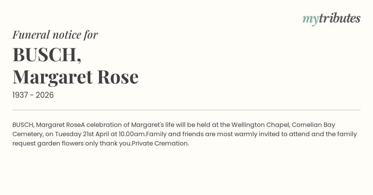A celebration of Margaret's life will be held at the Wellington Chapel, Cornelian Bay Cemetery, on Tuesday 21st April