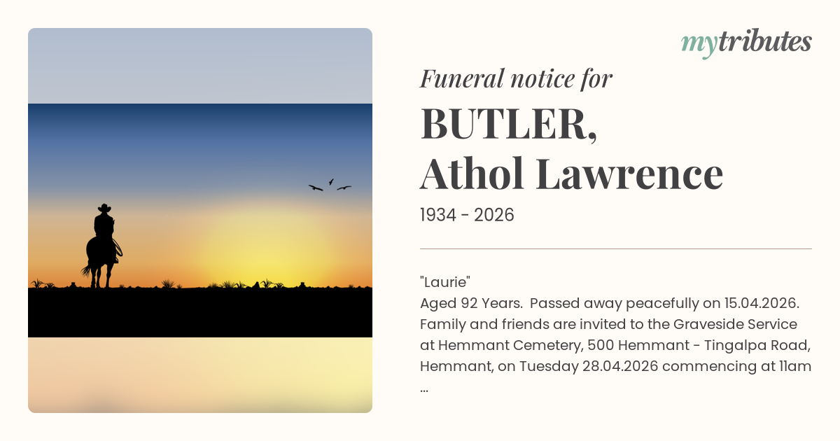 Family and friends are invited to the Graveside Service at Hemmant Cemetery, 500 Hemmant - Tingalpa Road, Hemmant, on Tuesday 28.04.2026 commencing at 11am