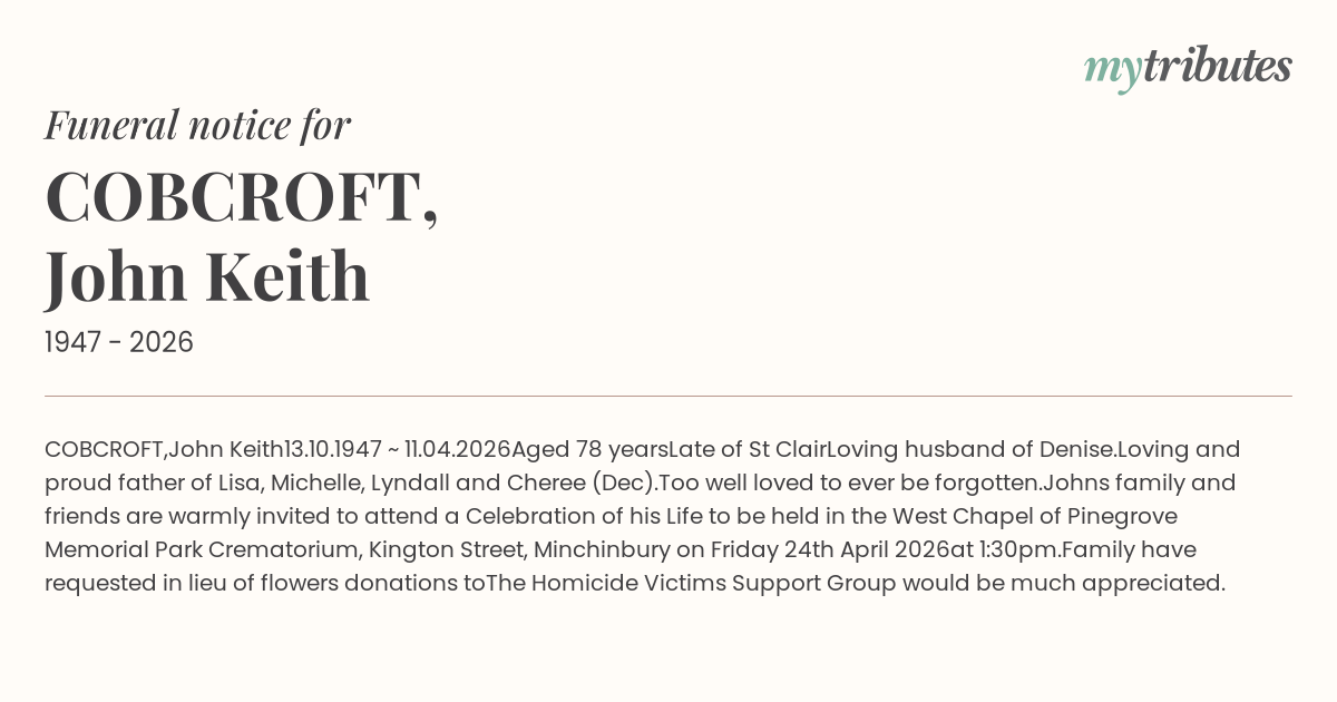 John’s family and friends are warmly invited to attend a Celebration of his Life to be held in the West Chapel of Pinegrove Memorial Park Crematorium, Kington Street, Minchinbury on Friday 24th April 2026