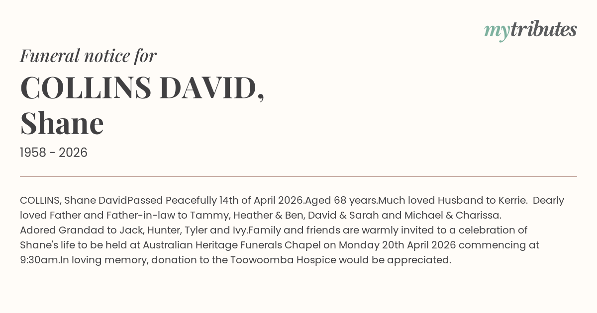 Family and friends are warmly invited to a celebration of Shane's life to be held at Australian Heritage Funerals Chapel on Monday 20th April 2026 commencing at 9:30am.