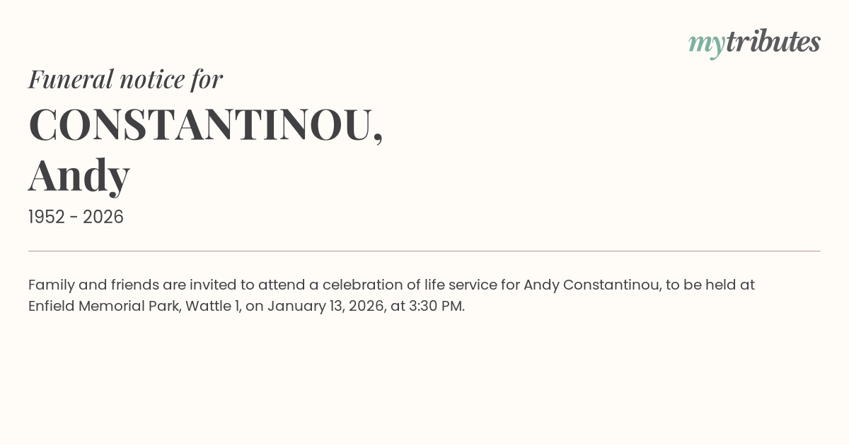 21°CFamily and friends are invited to attend a celebration of life service for Andy Constantinou, to be held at Enfield Memorial Park, Wattle 1, on January 13, 2026, at 3:30 PM.