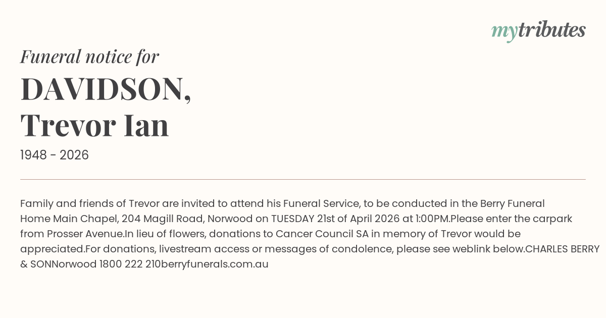21°CFamily and friends of Trevor are invited to attend his Funeral Service, to be conducted in the Berry Funeral Home Main Chapel, 204 Magill Road, Norwood on TUESDAY 21st of April 2026 at 1:00PM.