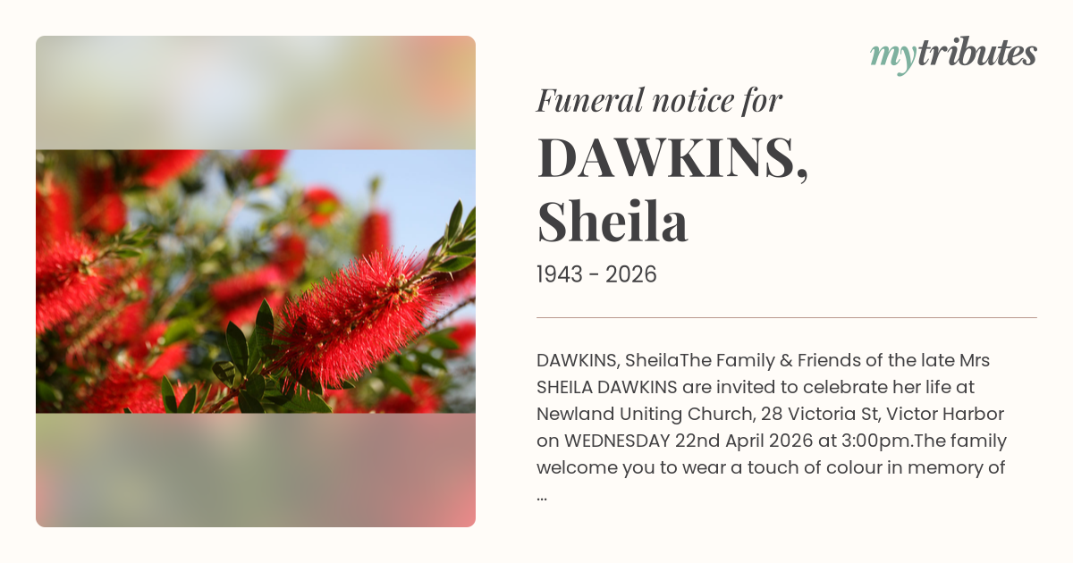 The Family & Friends of the late Mrs SHEILA DAWKINS are invited to celebrate her life at Newland Uniting Church, 28 Victoria St, Victor Harbor on WEDNESDAY 22nd April 2026 at 3:00pm.