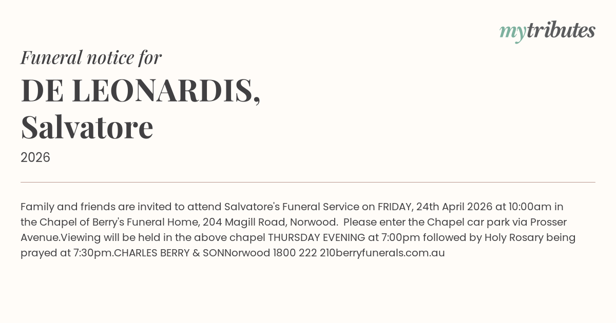 21°CFamily and friends are invited to attend Salvatore's Funeral Service on FRIDAY, 24th April 2026 at 10:00am in the Chapel of Berry's Funeral Home, 204 Magill Road, Norwood.