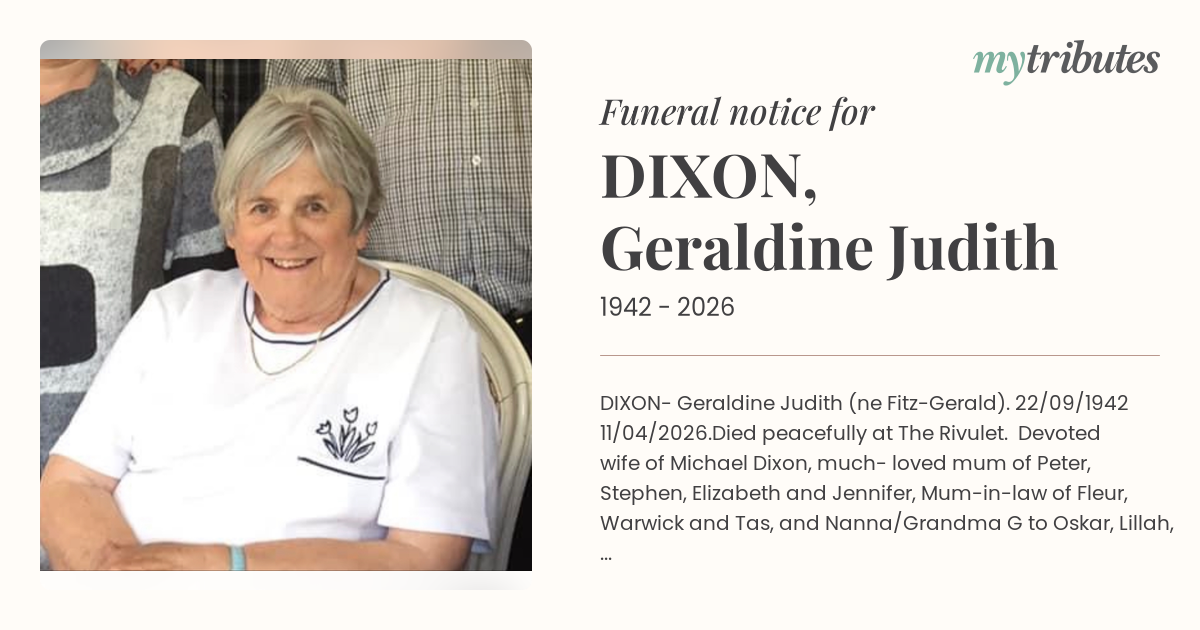 21°CDIXON- Geraldine Judith (née Fitz-Gerald). 22/09/1942 – 11/04/2026.