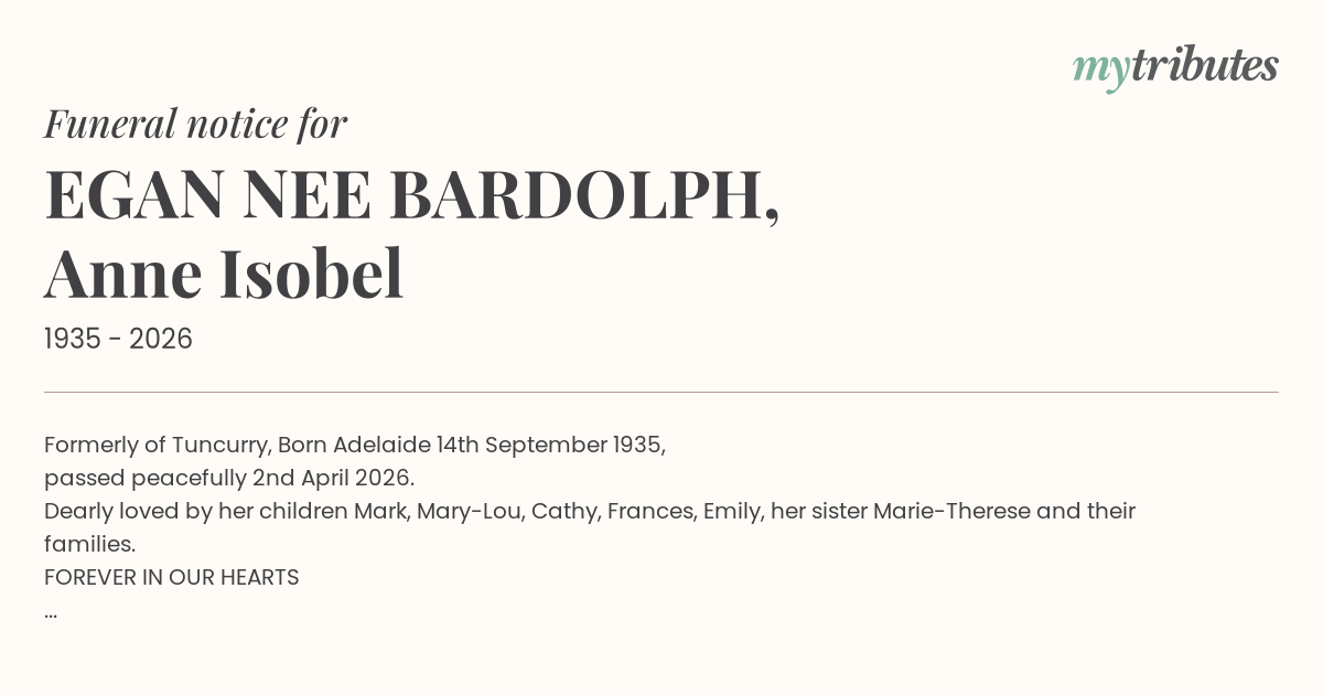 Family and friends are invited to Anne's requiem mass, Holy Name Church, Forster, Wed. 11am 22 April.