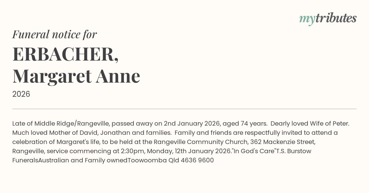 Family and friends are respectfully invited to attend a celebration of Margaret's life, to be held at the Rangeville Community Church, 362 Mackenzie Street, Rangeville, service commencing at 2:30pm, Monday, 12th January 2026.