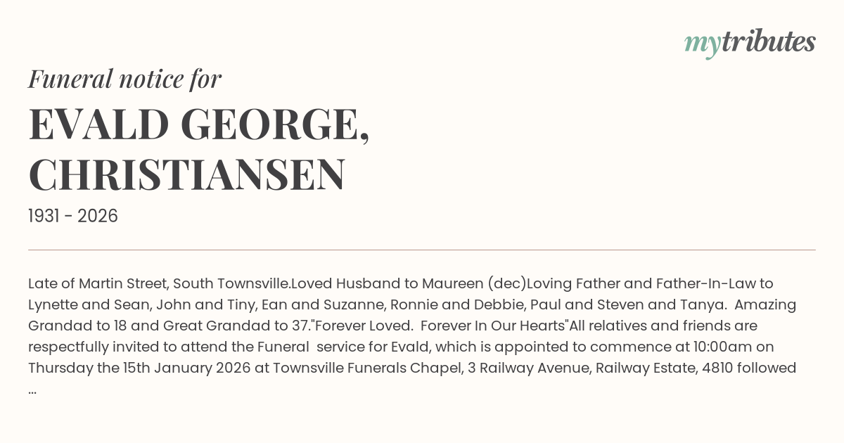 All relatives and friends are respectfully invited to attend the Funeral service for Evald, which is appointed to commence at 10:00am on Thursday the 15th January 2026 at Townsville Funerals Chapel, 3 Railway Avenue, Railway Estate, 4810 followed by interment in Belgian Gardens Cemetery.